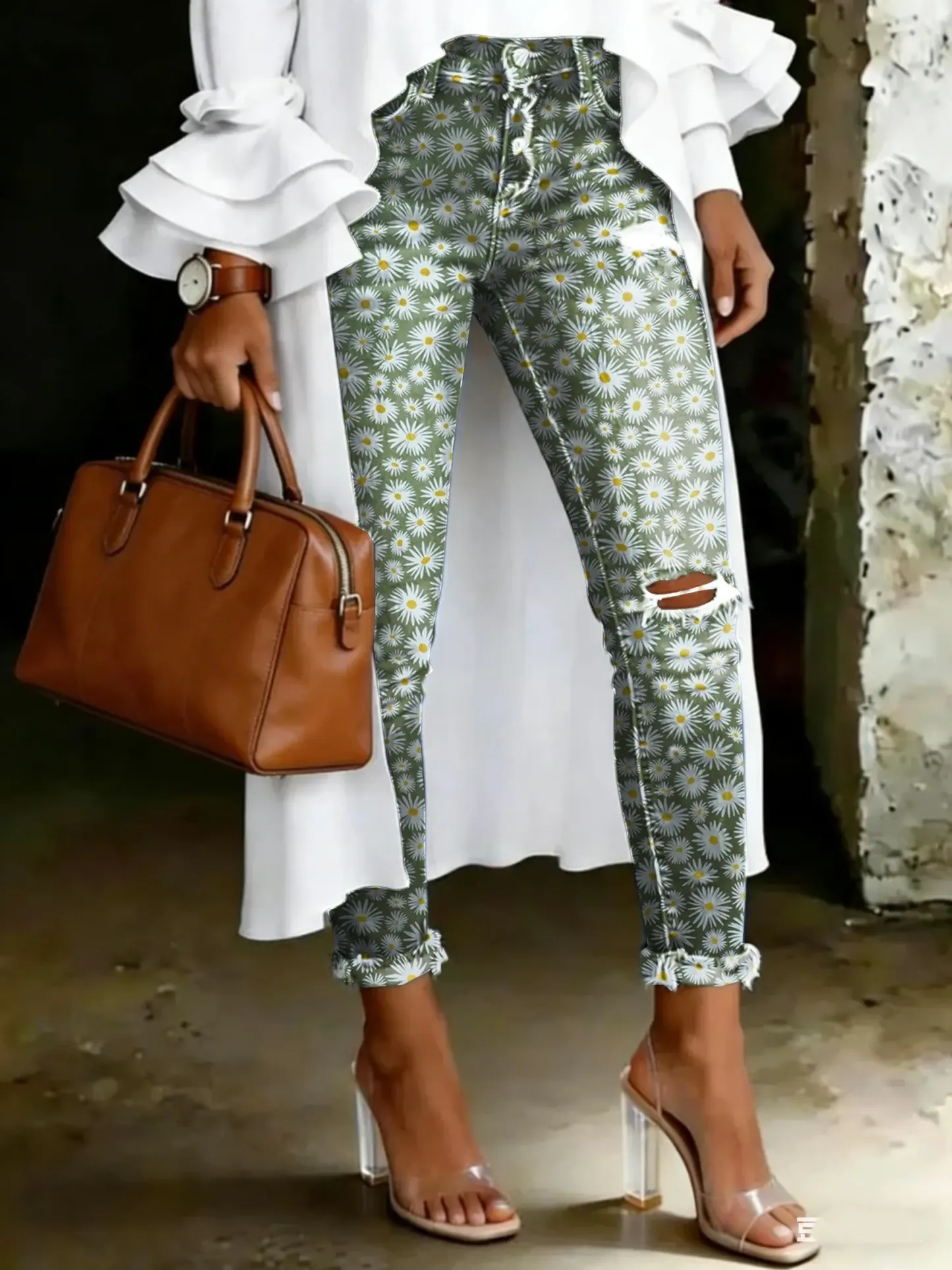 Women's Vintage Floral Print Casual High-waisted Ripped Skinny Jeans