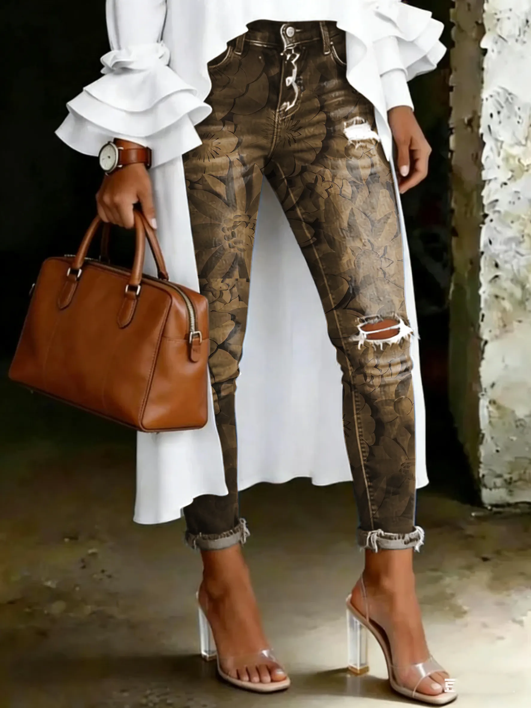 Women's Vintage Floral Print Casual High-waisted Ripped Skinny Jeans – lolonb