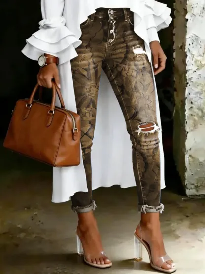 Women's Vintage Floral Print Casual High-waisted Ripped Skinny Jeans