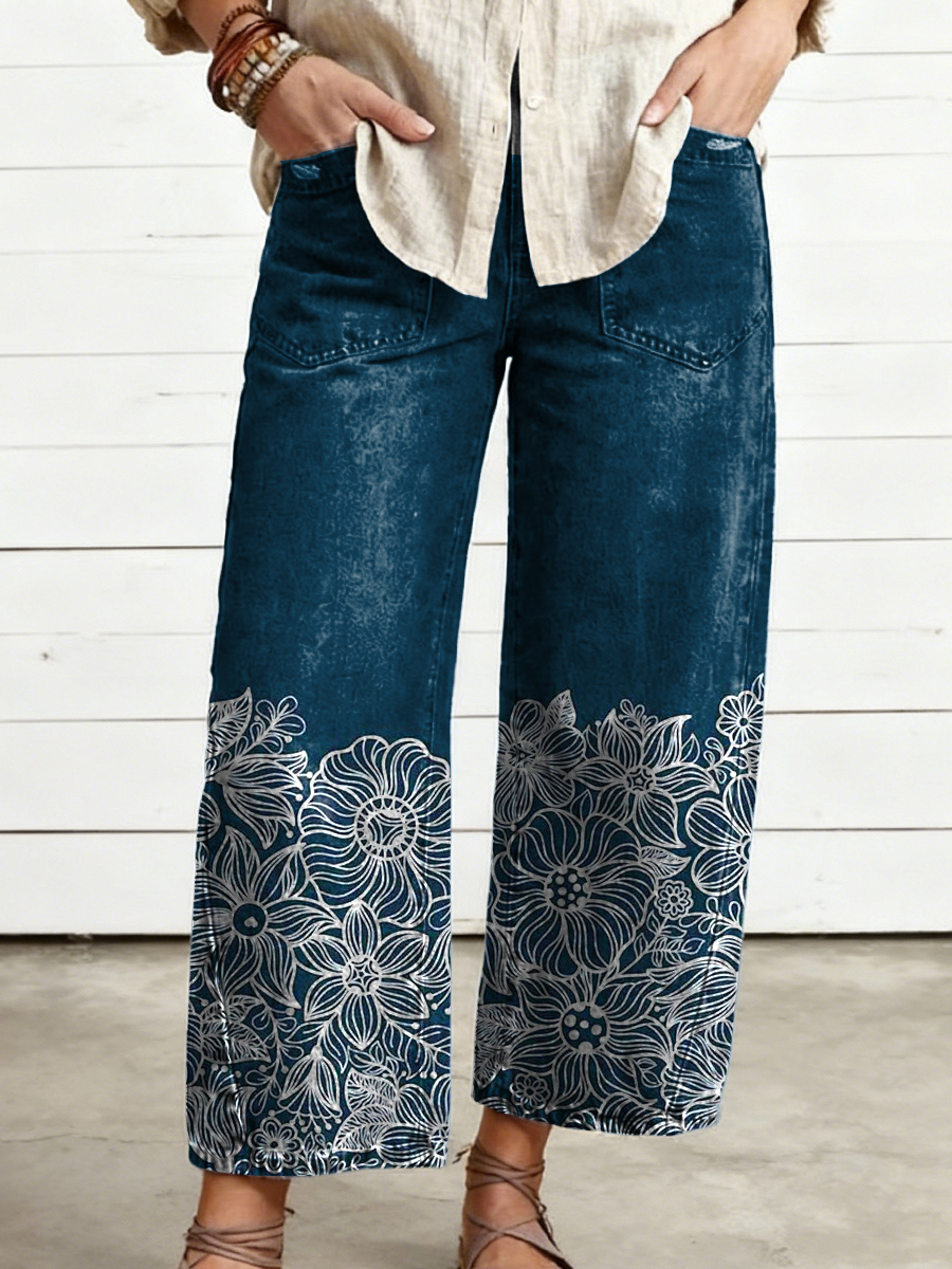 Women's Vintage Flower Art Print Casual Cotton Trousers With Pockets