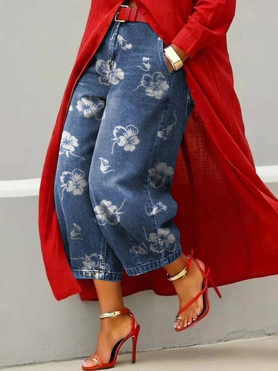 Women's Vintage Flower Art Print Casual Jeans