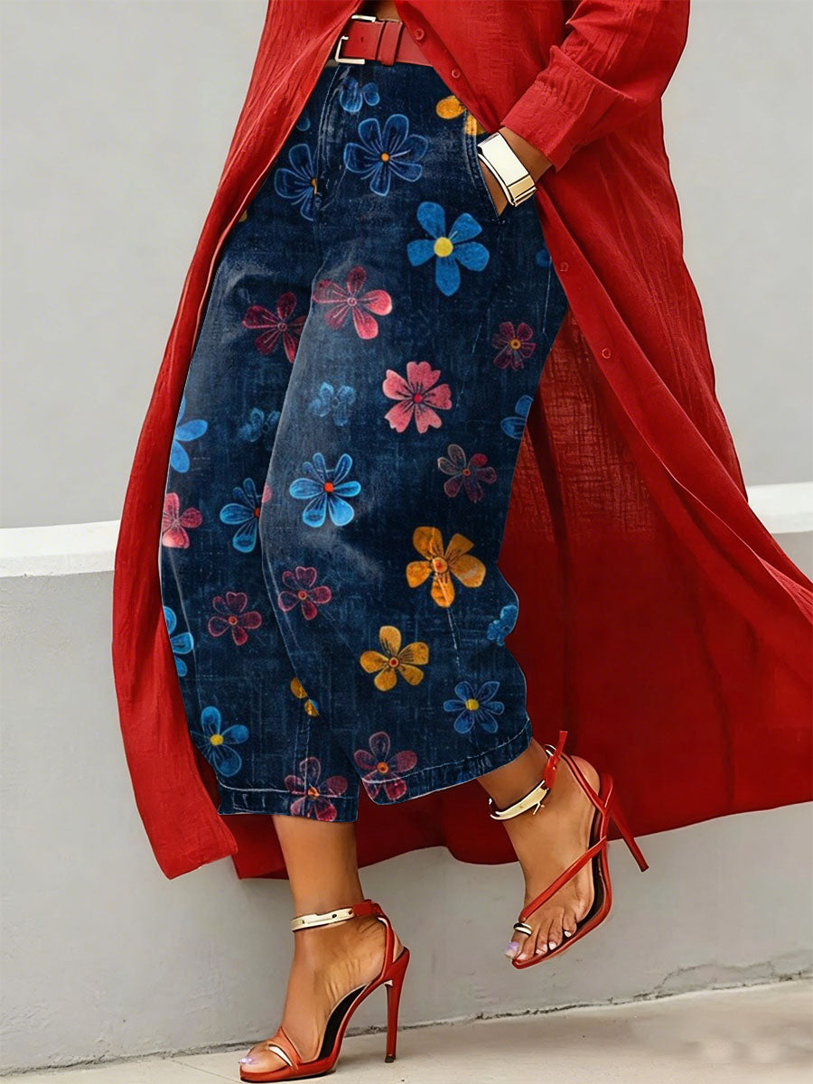 Women's Vintage Flower Art Print Casual Jeans – lolonb