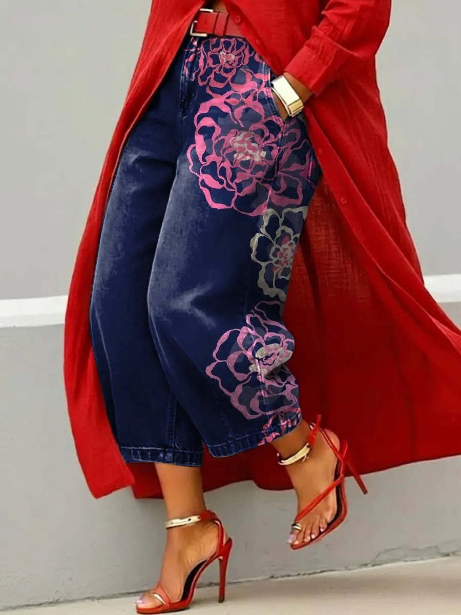 Women's Vintage Flower Art Print Casual Jeans – lolonb