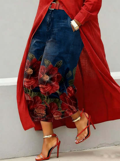 Women's Vintage Flower Art Print Casual Jeans – lolonb