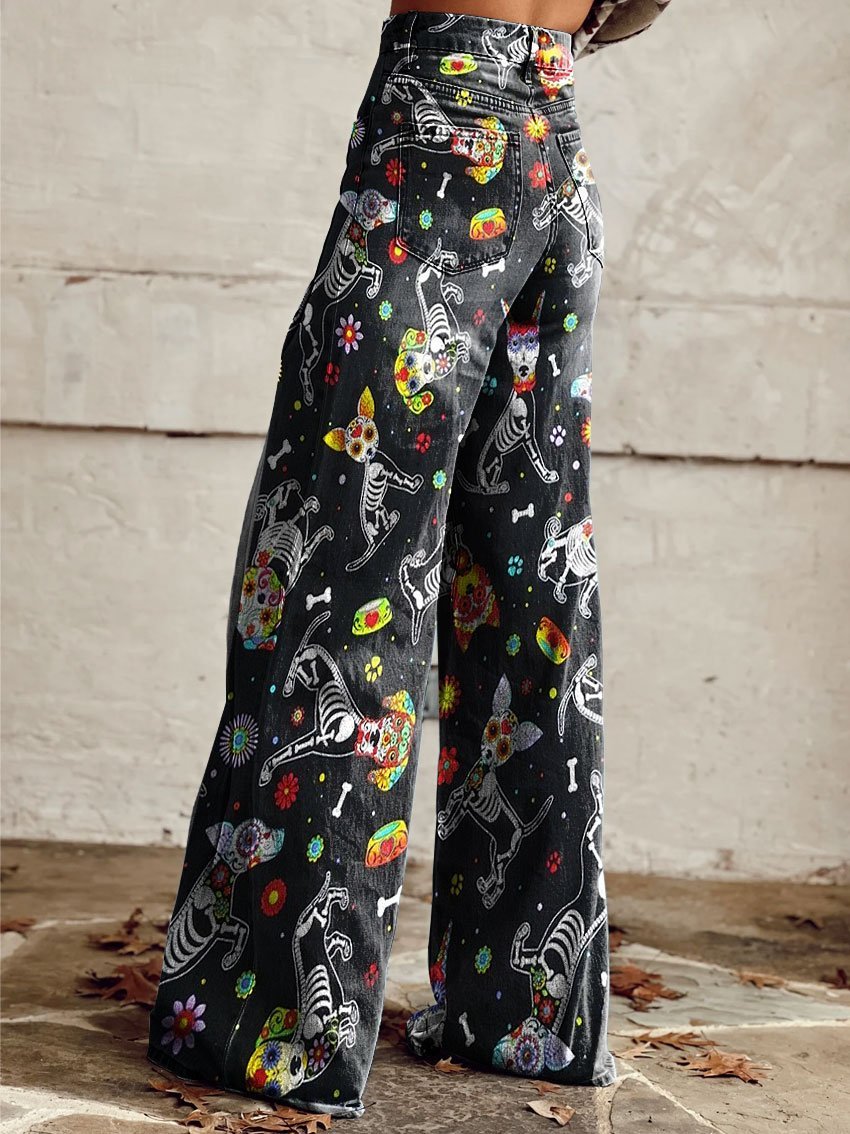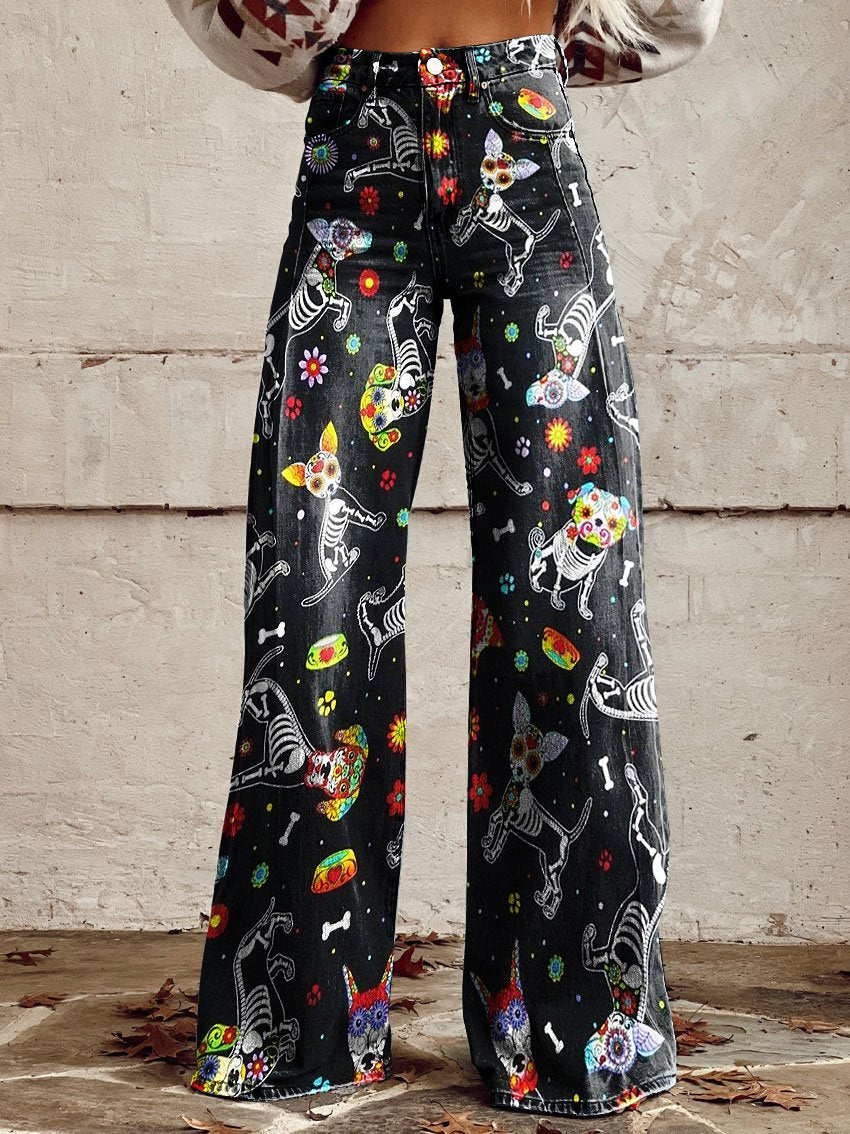 Women's Vintage Funny Dog Print Casual Wide Leg Pants