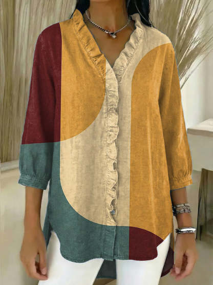 Women's Vintage Geometry Print Casual Ruffled Shirt