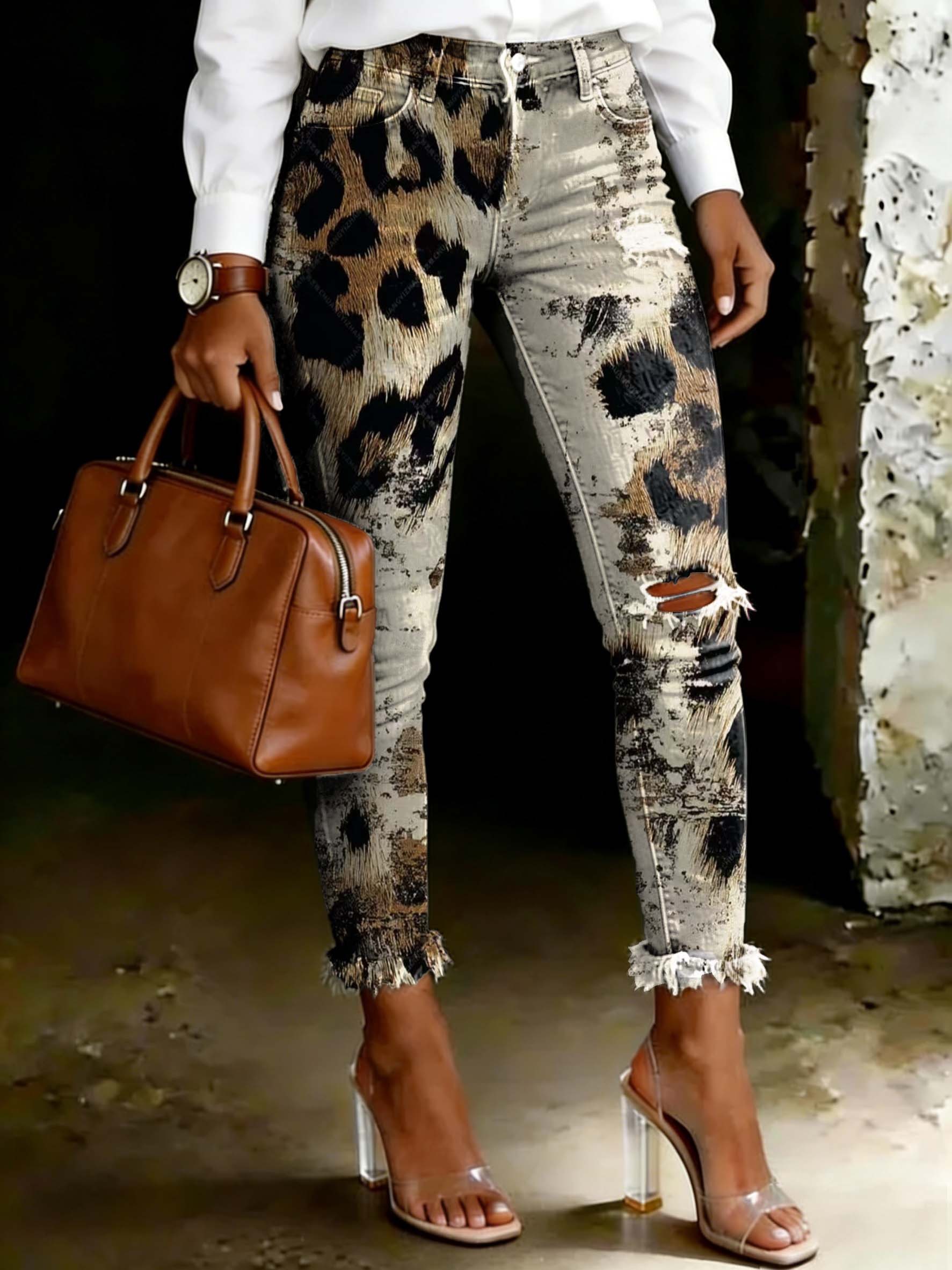 Women's Vintage Gradient Leopard Print Art Ripped Skinny Jeans