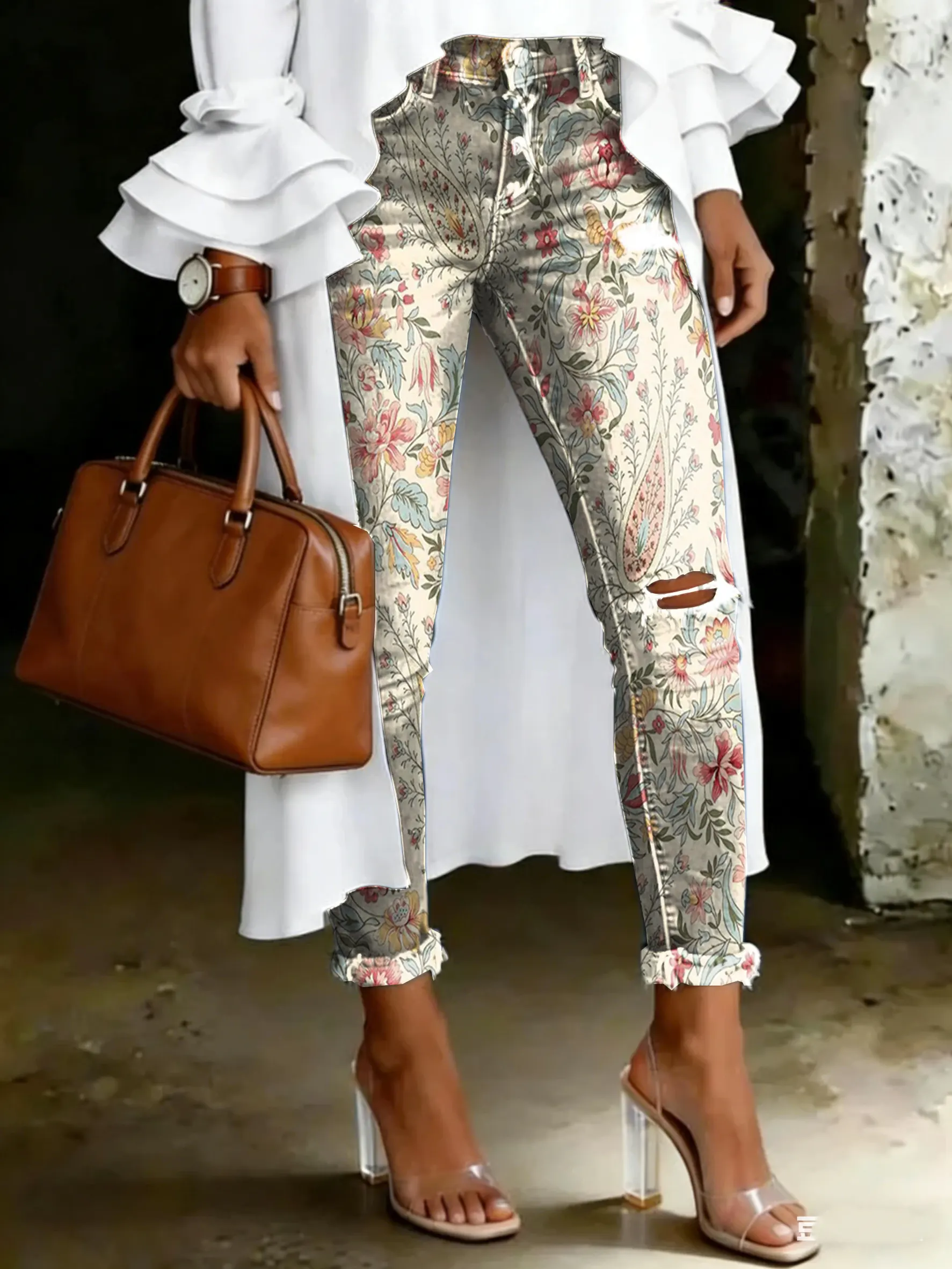 Women's Vintage Paisley Floral Print Casual High-waisted Ripped Skinny Jeans