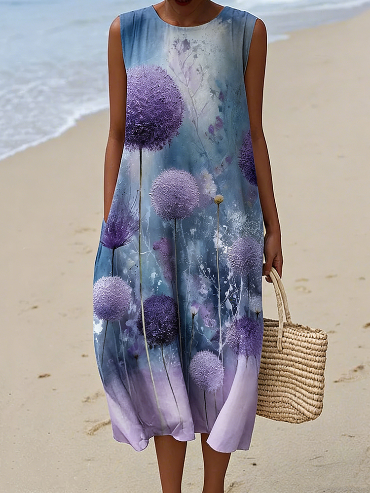 Women's Vintage Purple Dandelion Art Print Casual Sleeveless Dress