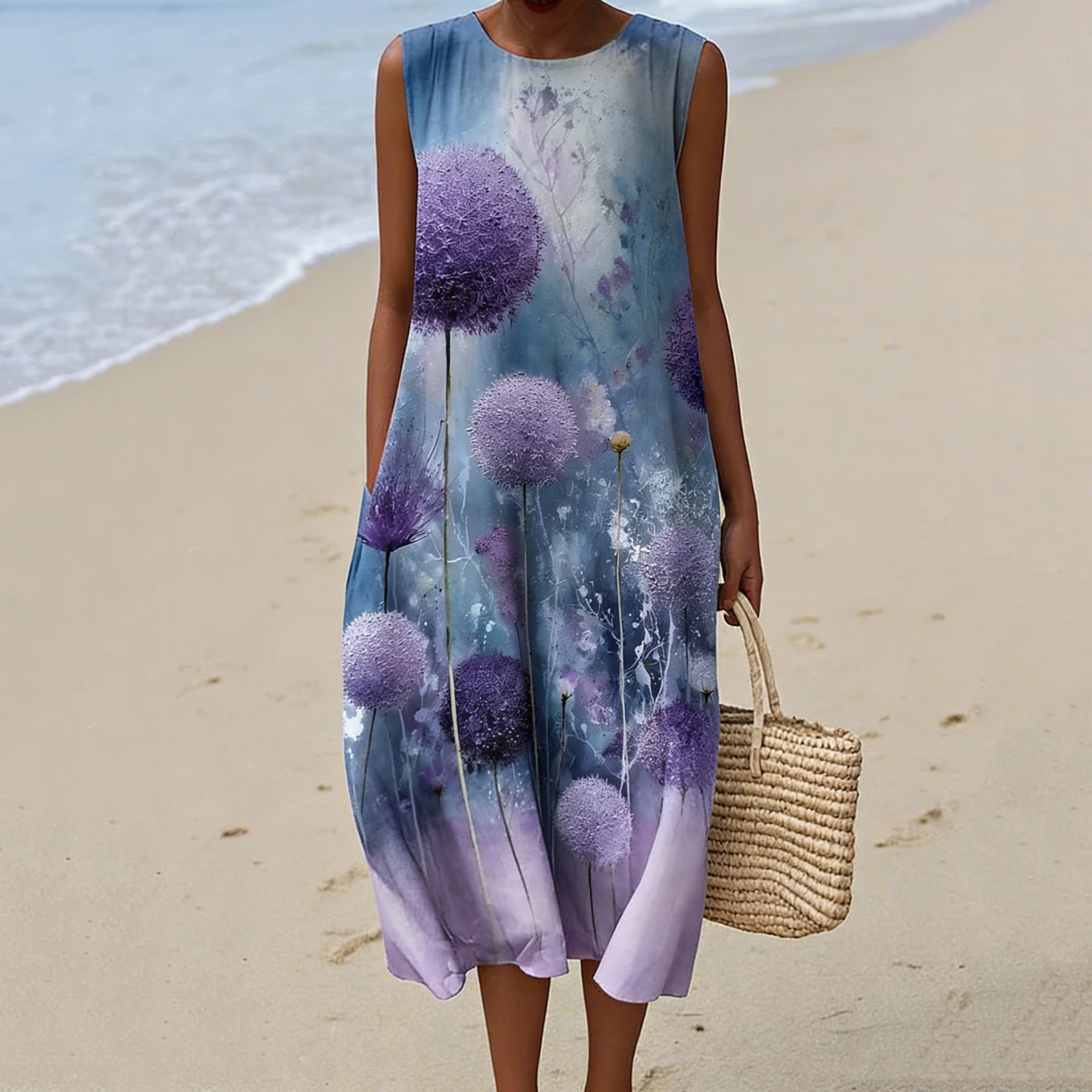 Women's Vintage Purple Dandelion Art Print Casual Sleeveless Dress – lolonb
