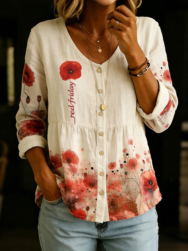 Women's Vintage Red Friday Floral Print Casual Top