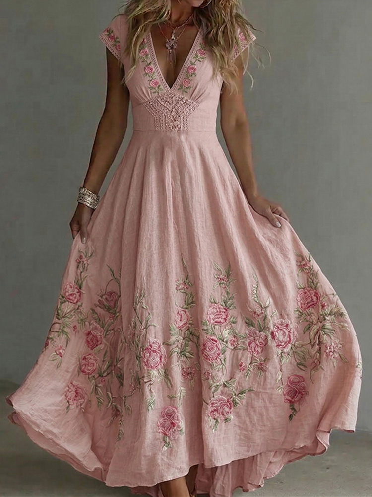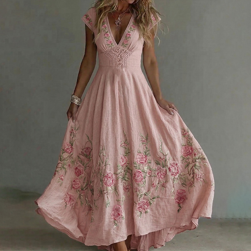 Women's Vintage Rose Floral Art Flowy Linen Blend Maxi Dress – lolonb