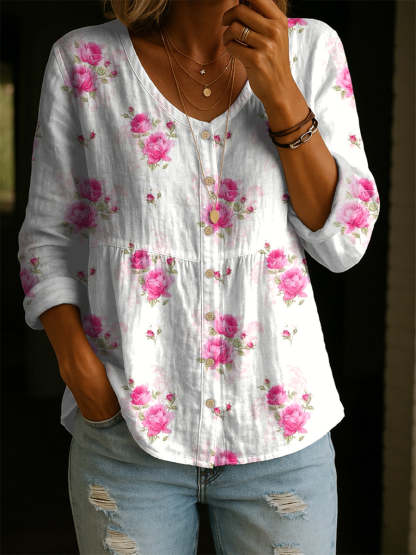 Women's Vintage Rose Flower Art Print Linen Cotton Shirt