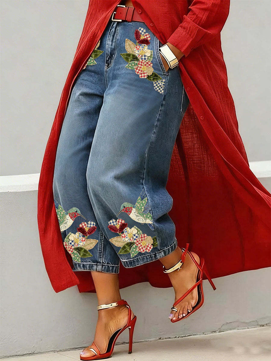 Women's Vintage Spliced Pattern Art Print Casual Jeans