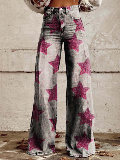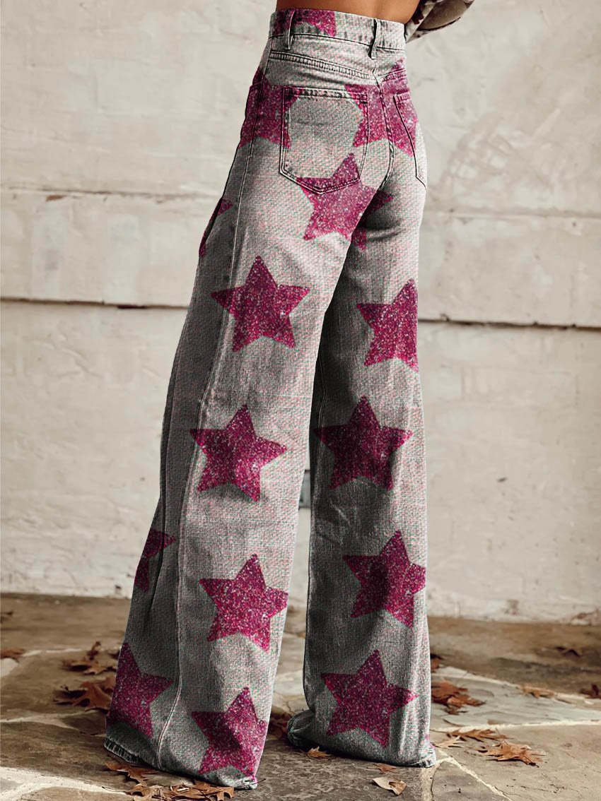Women's White Pink Star Print Casual Wide Leg Pants