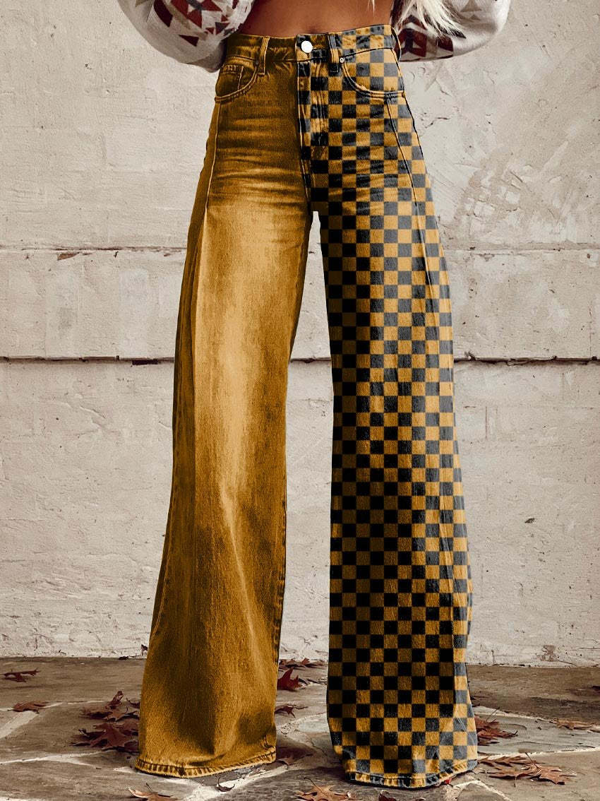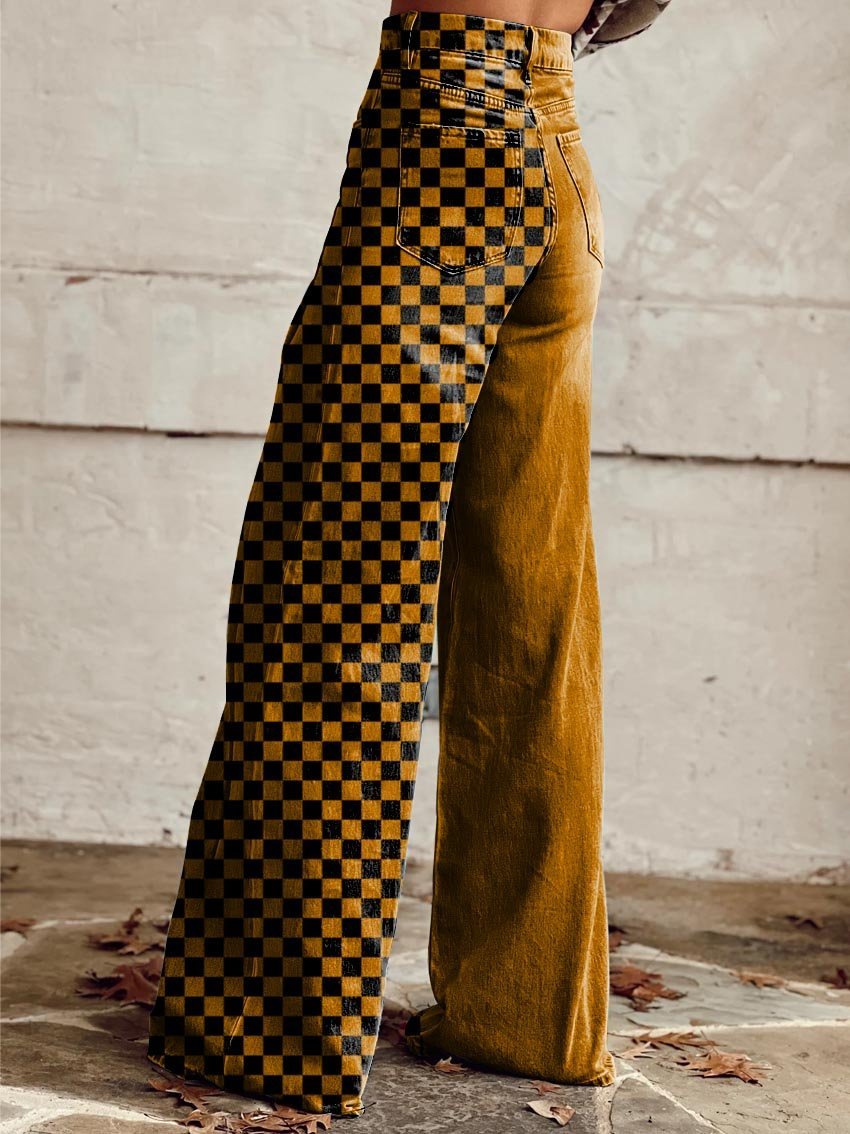 Women's Yellow and Black Tartan Print Casual Wide Leg Pants
