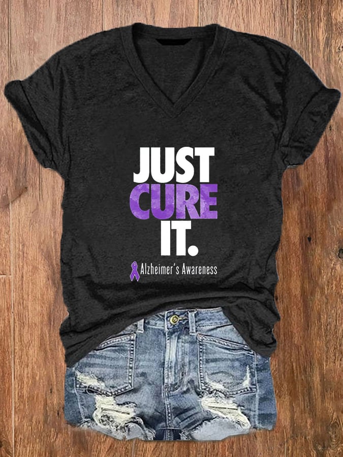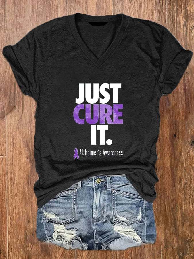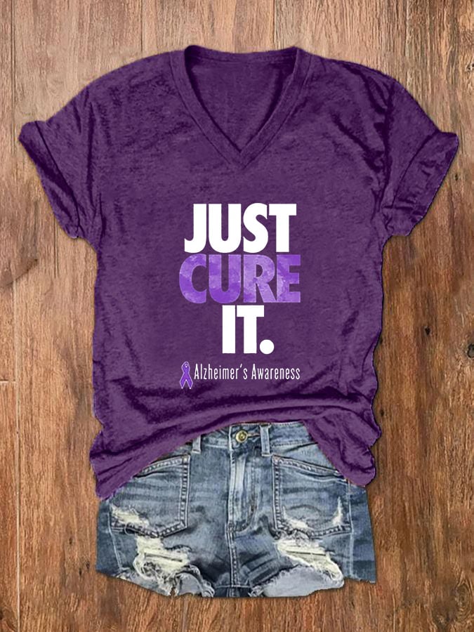Women'sJust Cure ALZ Dementia Alzheimer's Awarenes Purple Ribbon Print O-Neck T-Shirt