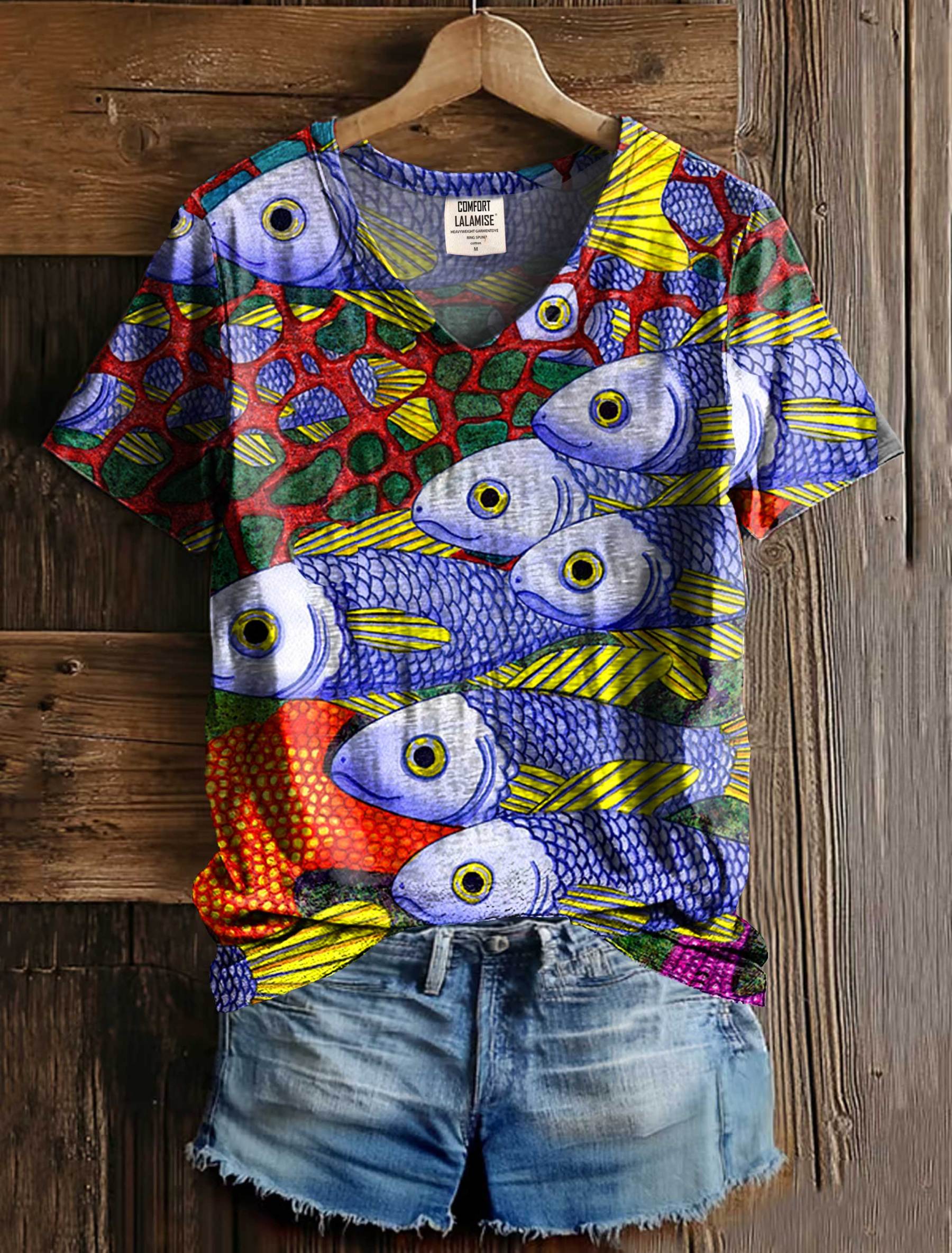 Vintage Fish Art Print V-neck Casual T-Shirt