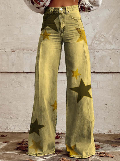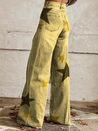 Women's Yellow Star Print Casual Wide Leg Pants