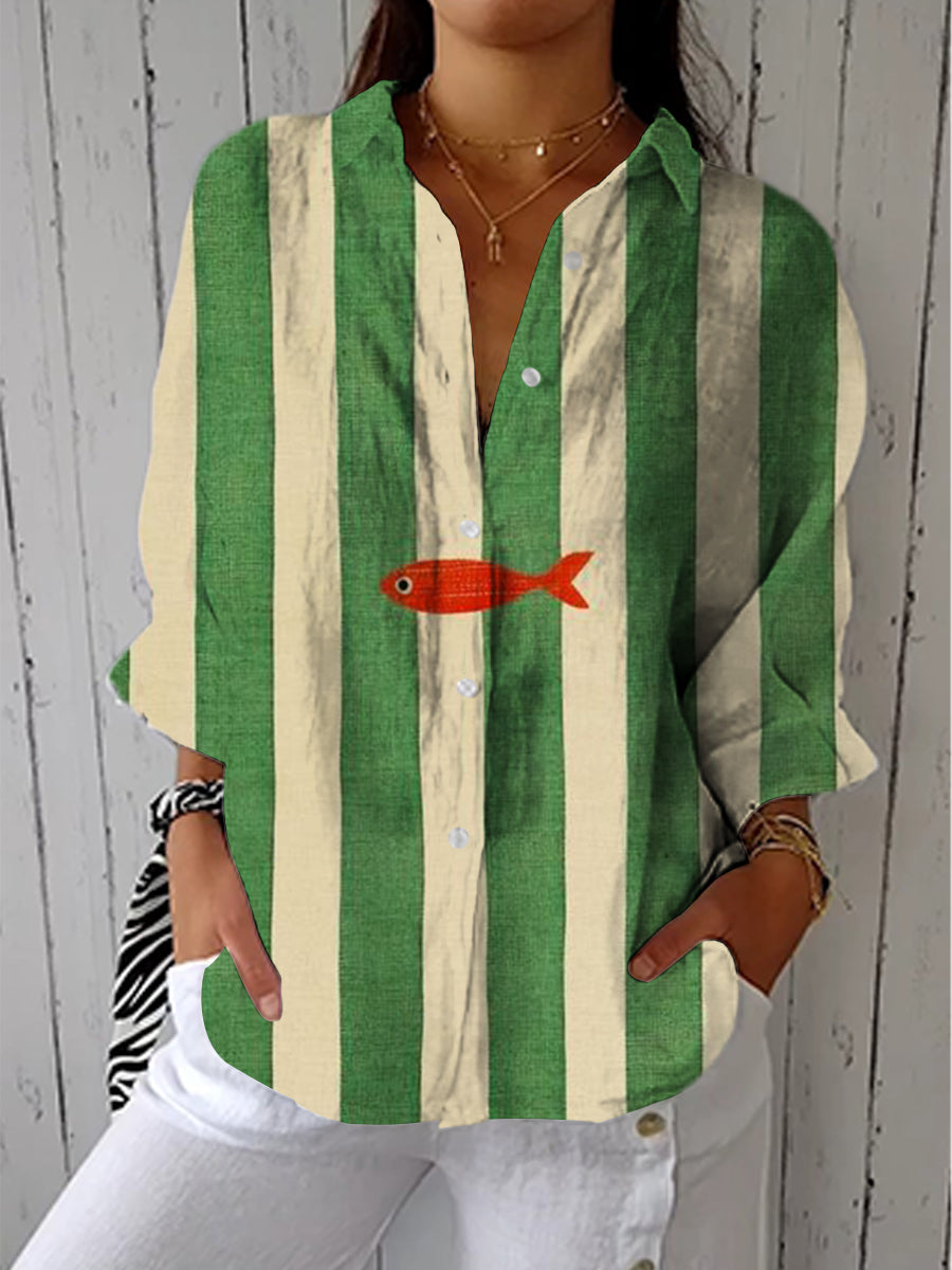 Women's Art Green Line Fish Print Casual Linen V-neck Shirt