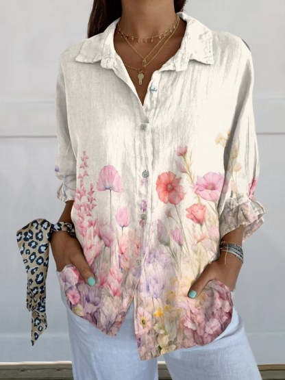 Women's Pink Floral Print On Hem Casual Linen V-neck Shirt