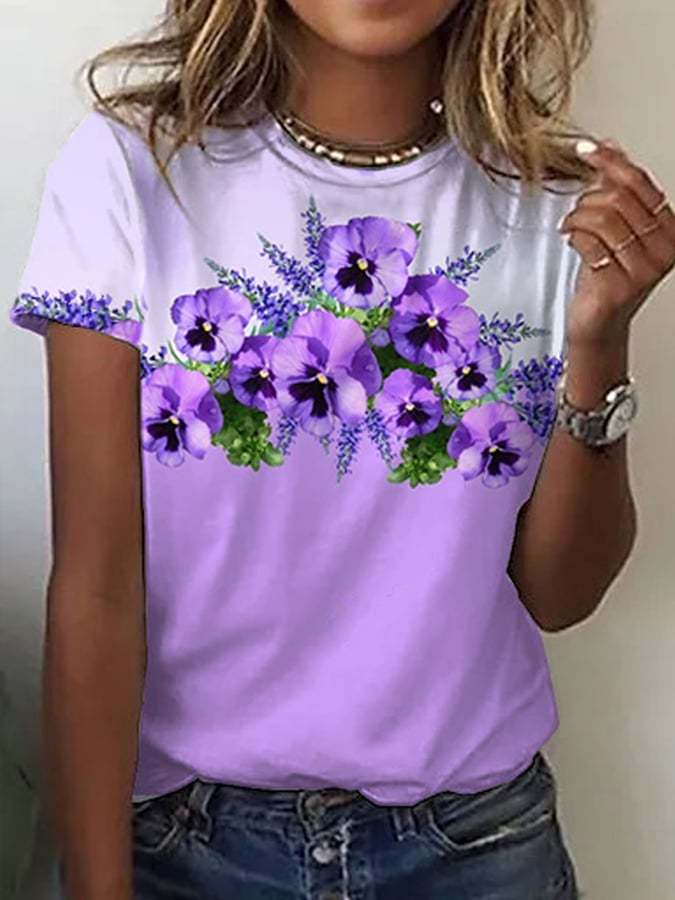 Women's Purple Flower Alzheimer's Awareness Support Casual O-Neck Tee